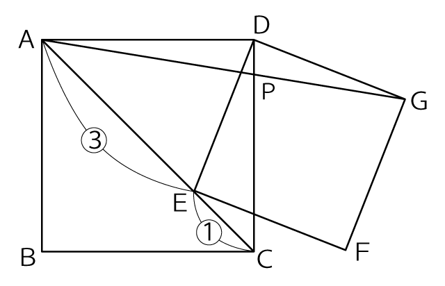 上の図のように、正方形ABCDの対角線AC上に、AE:EC=3:1となる点をとりました。さらに、辺DEを一辺とする正方形EDFGを、頂点FおよびGが、辺DEに対して右になるように作りました。